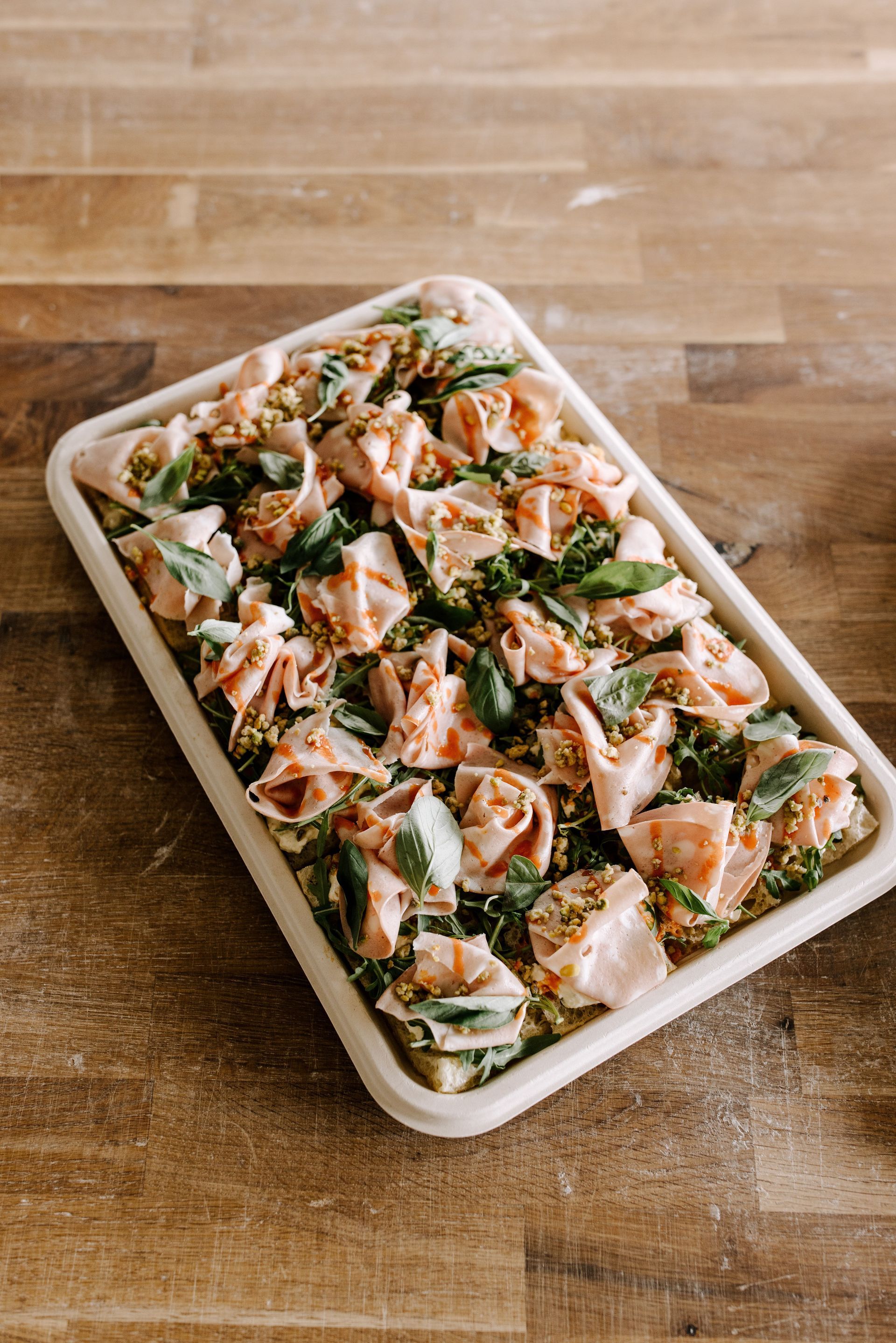 1. Mortadella, ricotta, hot sauce & pistasiu crumble